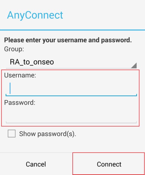 12. Enter your domain credentials (without \SEO) into the form shown below and tap the "Connect" button: