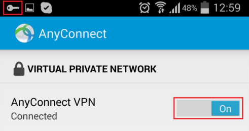 13. If all steps done properly, the "key" icon appears and the "AnyConnect VPN" button switches to "On" position.