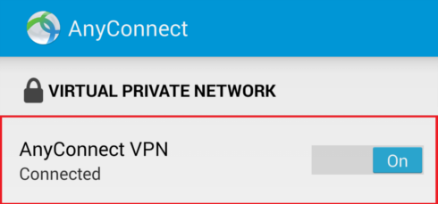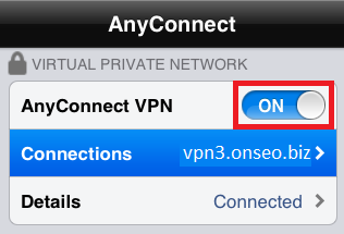 9. If all steps done properly, the "VPN" icon appears and the "AnyConnect VPN" button switches to "On" position.