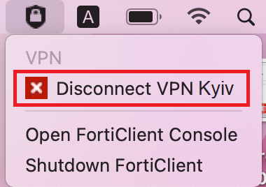 1. Press the tray icon, shown on the image below and click the "Disconnect VPN Kyiv" button: