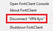 1. Press the tray icon, shown on the image below and click "Disconnect VPN Kyiv":